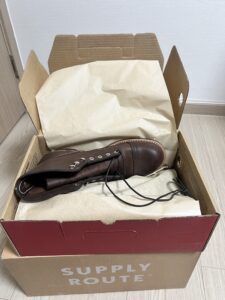 레드윙 공식 홈페이지에서 주문한 신발이 서플라이루트(Supply Route) 박스에 담겨 안전하게 도착했습니다. 붉은색 레드윙 박스를 열자마자 가죽 특유의 묵직한 향이 방 안을 채웠습니다.