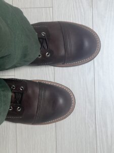 발가락 부분에 가죽을 덧댄 캡 토(Cap-toe) 디자인은 둥글면서도 튼튼한 인상을 줍니다. 앰버 하니스 가죽은 만졌을 때 뻣뻣하지만 은은한 광택이 돌아 자꾸 눈길이 갑니다. 처음 끈을 묶으며 이 단단한 신발을 길들이는 과정이 기대되었습니다.