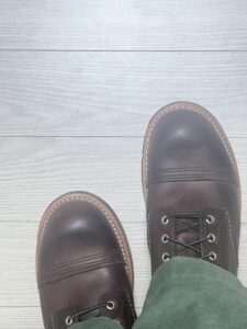 발가락 부분에 가죽을 덧댄 캡 토(Cap-toe) 디자인은 둥글면서도 튼튼한 인상을 줍니다. 앰버 하니스 가죽은 만졌을 때 뻣뻣하지만 은은한 광택이 돌아 자꾸 눈길이 갑니다. 처음 끈을 묶으며 이 단단한 신발을 길들이는 과정이 기대되었습니다.